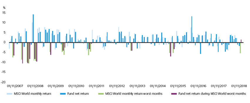 Figure 4: Outperformance vs MSCI World during the 15 worst down months 2007 - 2018